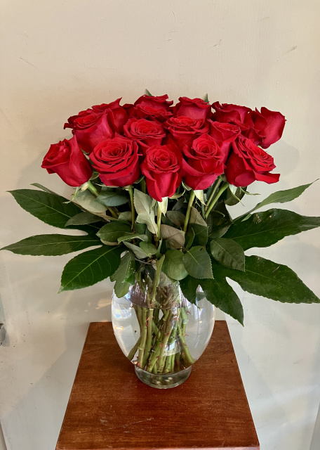 Large glass bowl 24 red roses large green leaves 18 inches high overall