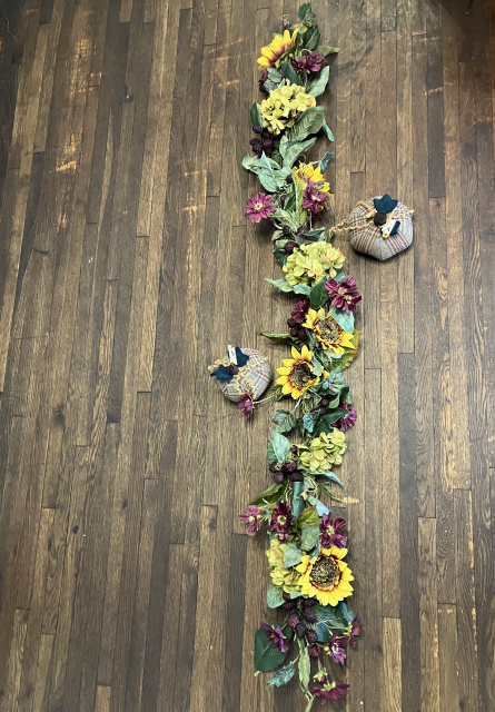 5.5 feet long artificial garland sunflowers cosmos berries hydrangeas and greenery with 2 soft sculpture plaid pumpkins to accent garland on table or mantle