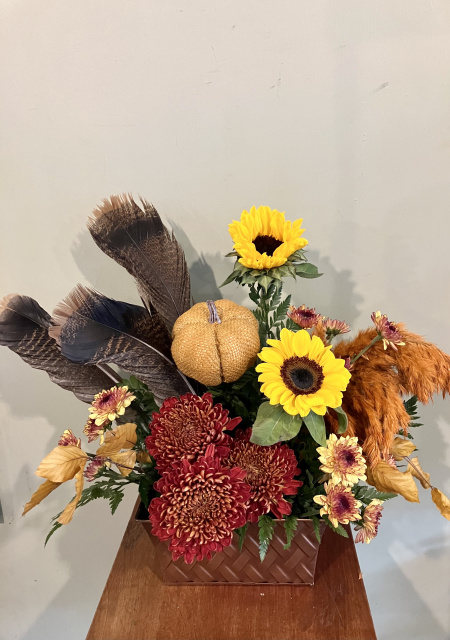 Copper colored basket weave tin filled with turkey feathers sunflowers mix of fall mums grasses and burlap pumpkin 18 inches high overall