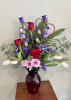 Red glass vase filled with roses tulips campanula button mums mixed ferns and a double heart accent 16 inches high overall