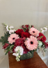 Large glass cube filled with hydrangeas roses fragrant stock tulips Gerber daisies alstroemeria and mixed greens 11 inches high overall