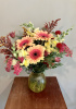 Yellow jar filled with Gerbera daisies snapdragons Yarrow mums and other filler flowers 15 inches high overall