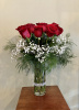 Glass cylinder vase with faux rhinestone band 12 Red/ Lt Pink/ Hot Pink/ White/ Lavender OR Coral roses Ring of babies breath and misty fern 20 inches high overall