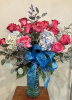 Teal glass vase filled with 12 deep pink roses, blue hydrangeas, sea lavender and mixed greens with glittery teal bow 24 inches high overall