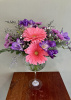 Glass goblet filled with Gerbera daisies Freesia button daisies fern sea lavender and babies breath 13 inches high overall
