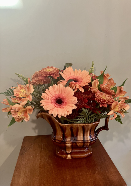Large brown ceramic gravy boat filled with Gerbera daisies Alstroemeria berries Solidago and mixed fall mums 12 inches high over all