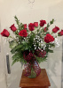 Clear glass vase with 12 long stem deep red roses babies breath mix greenery& velvet open Weave bow 24 inches high overall