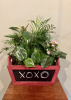 Chalkboard wood box filled with 4 easy care indoor house plants and one blooming succulent 20” wide overall