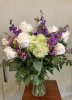 Clear glass vase filled with white roses purple fragrant stock waxflower green hydrangeas mixed greens 22 inches high overall