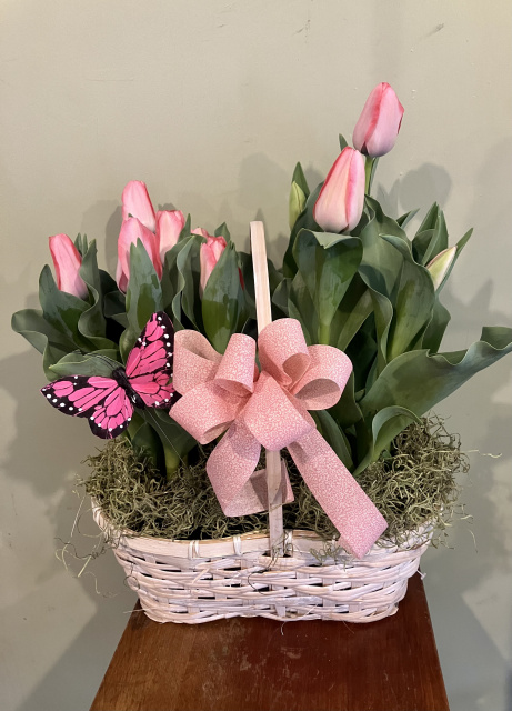 Oval White wash basket filled with 10 blooming pink tulips accent with ribbon and butterfly 12” wide
