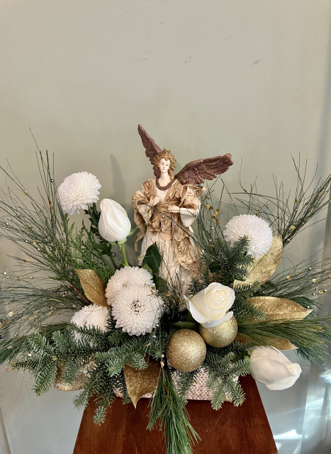 White wash woven basket filled with paper and resin glorious angel tree topper surrounded by fresh evergreens white mums white roses artificial pine with sequins glitter magnolia leaves and glitter ornaments 23 inches wide 18 inches high