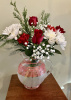 Vintage glass frosted and red stripe pitcher filled with cedar white snow flake mums red roses and red carnations with babies breath 17” high overall