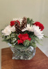 Crystal sleigh filled with Evergreens pinecones snowy mums carnations pinecones mixed evergreens 10 inches high overall