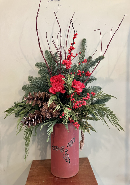 Hand cut holly in tin can very primitive and rustic filled with evergreens pinecones winter berries red twigs and carnations 27 inches high overall