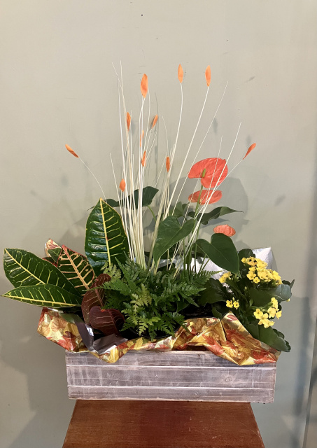White Wash Wood box filled with colorful mix of indoor blooming and non-blooming plants including Antherium kalanchoe fern and Croton accented with dried grass 22 inches high overall