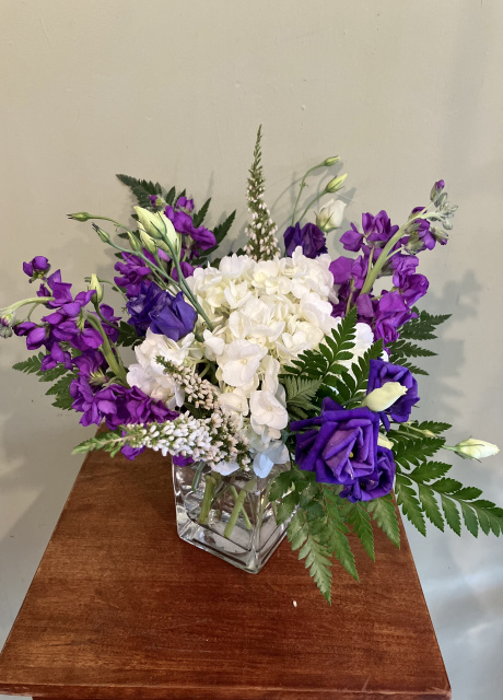 Glass cube with fragrant purple stock Lisianthus hydrangea and Heather 7” high overall