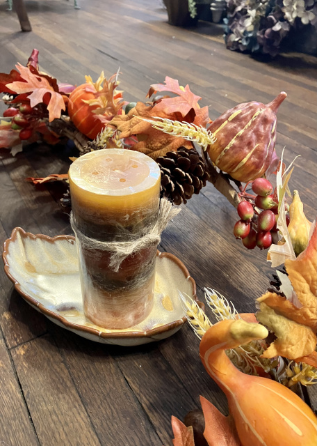 Artificial garland of pumpkins gourds fall leaves in bright oranges Burgundy greens 6 foot long with two vintage ceramic leaves in buttercream to brown with layered pillar candle 3 x 6 with twine