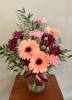 Hobnail clear glass storage container with accent ribbon filled with Gerber daisies carnations daisies and mixed greens 12 inches high overall
