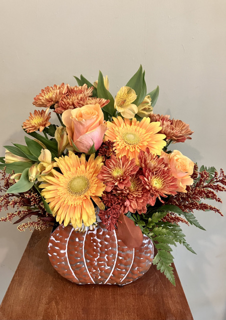 Metal pumpkin container filled with Gerbera daisies Alstroemeria mums roses and filler flowers 14 inches high overall
