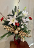 Red glass vase filled with winter greens lilies carnations snow drift mums artificial berries twigs and glitter ornaments 24 inches high