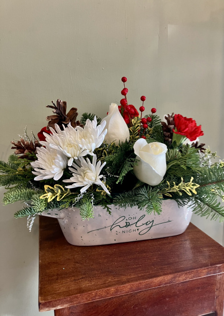 Baking dish filled with evergreens pinecones white roses White snow drift pom-poms sea lavender and artificial berries 18 inches inches wide overall