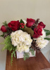 Whitewashed wood box filled with Hydrangeas six red roses berries winter greens and pinecones 11 inches high over