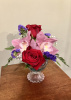 Glass dessert compote filled with orchids roses and mix filler flowers and greens 6 inches high overall