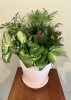 White ceramic planter with tray 4easy care inside green plants with blooming succulent 15 inches high overall