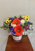 Rustic 6 “barrel with metal straps filled with 1 hydrangea 2 Gerbera daisies mini sunflower mums Alstroemeria statice babies breath with fern 13” high overall