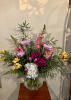 Geometric clear glass vase filled with tulips hydrangeas alstroemeria Gerbera daisies snapdragons Veronica Dahlia mums mixed greens 24 inches high overall