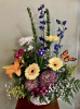 White washed basket filled with lily Mums daisies Iris Sweet William Gerber daisies delphinium babies breath accent of feather butterfly and mixed greens 22 inches high overall