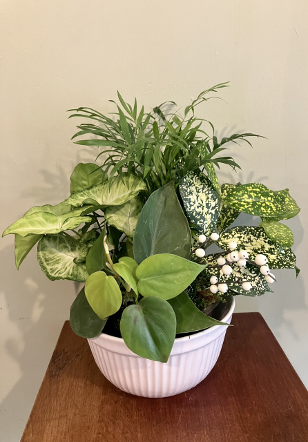 White ceramic container filled with 4 indoor easy care plants accent it with white artificial berries 13 inches high over all