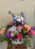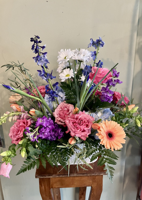 White washed wood box filled with roses Gerbera snapdragons hydrangea tulips campanula delphinium daisies stock mixed greens 20” high overall