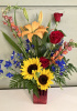Red glass cube filled with roses lily snapdragons delphinium sunflowers 18 inches high overall