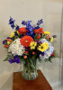 Glass vase filled with hydrangeas Gerber daisies delphinium tulips daisies 22” high overall