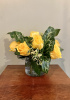 Small glass cylinder with six yellow roses mixed find greens 8 inches overall