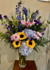Clear glass vase filled with hydrangeas sunflowers delphinium Campanula button mums Solidago with greens 24 inches high overall