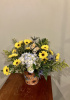 black eyed Susies on malimac container filled with mini sunflower mums thistles hydrangea Solidago with feather butterfly 8 inches high overall
