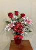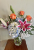 Lilies roses hydrangeas and babies breath and glass vase 18 inches high over all