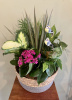 Gray and natural basket filled with five easy care indoor plants blooming succulent and two birds singing songs of peace overall 21 inches high