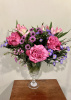 Glass compote filled with three roses Waxflower wild purple daisies alstroemeria micro daisies and greenery 12 inches high overall