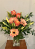 Square glass vase filled with tulips Gerber daisies and roses 16 inches high overall