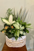 2 Toned rope basket with handle on side filled with six easy care indoor green plants with blooming succulent 22 inches high overall